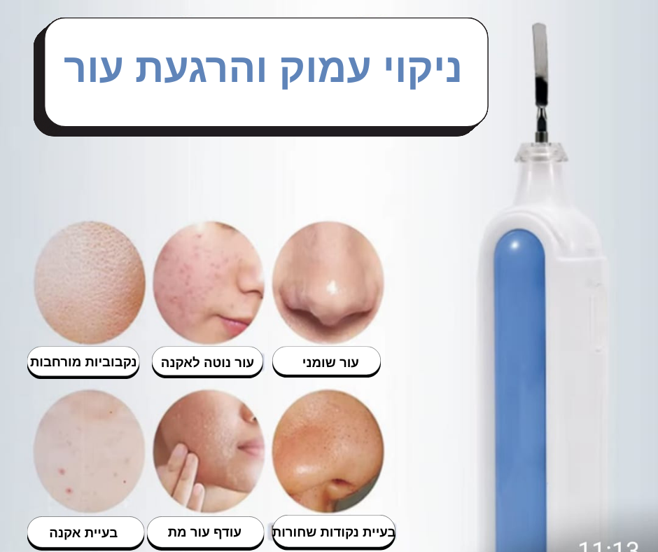ניקוי עמוק ויסודי: מסיר ראשים שחורים, שאריות איפור וזיהום סביבתי שהצטבר בנקבוביות.